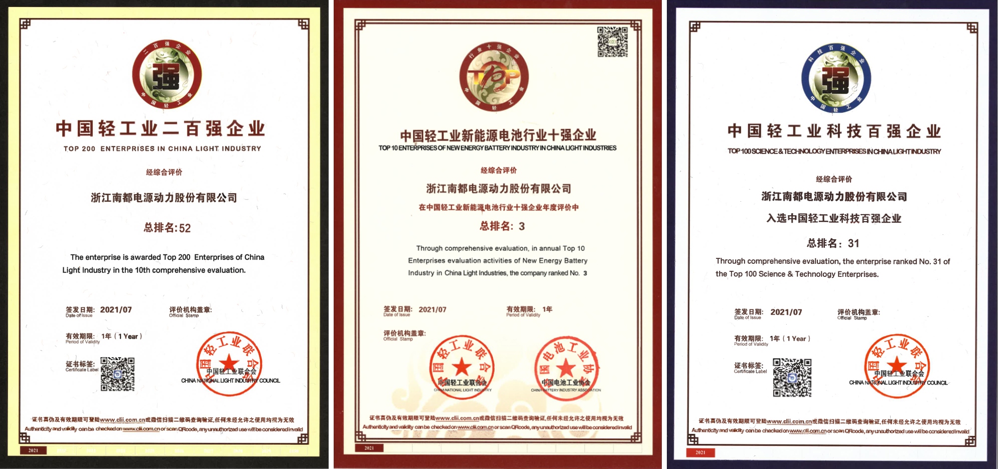 日前,,,,,,,,中国轻工业团结会宣布了 2020 年度中国轻工业二百强企业榜单,,,,,,,,beats365再次入选,,,,,,,,位列第 52 位,,,,,,,,同时公司还荣获了中国轻工业科技百强榜第 31 位和中国轻工业新能源电池行业十强榜第 3 位。。。。。这也是“中国轻工业百强企业”自 2011 年宣布以来,,,,,,,,beats365一连十年上榜。。。。。
